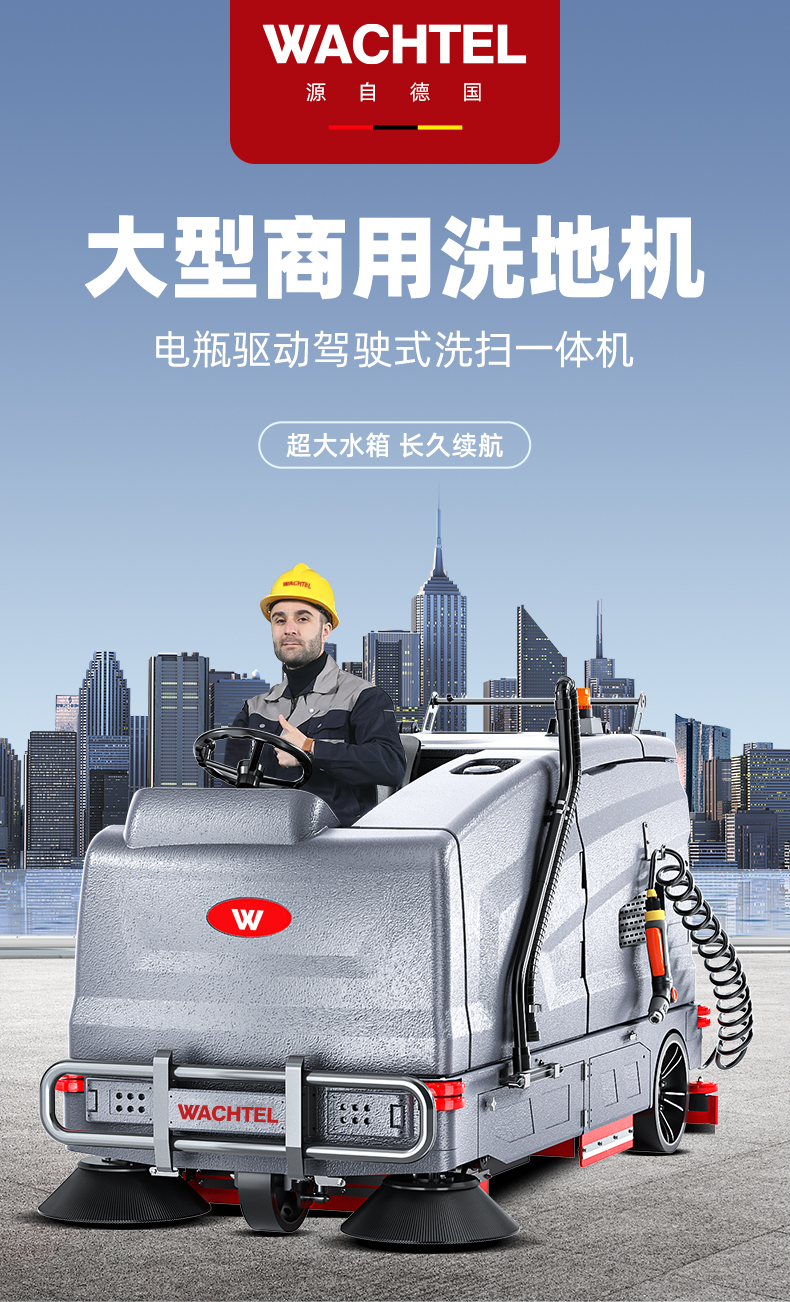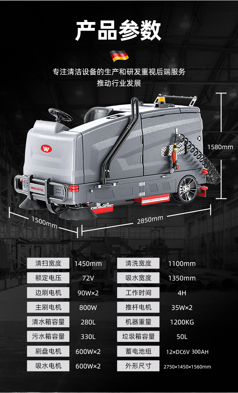 品牌:WACHTEL 名稱:超大型駕駛式洗掃一體機SX1450 型號: SX1450 清掃寬度:1450mm 清潔效率:12800m²/h 工作時間:3~6h 水箱容量:280L/330L(清/污) 電池:意大利OM鋰電 電機::德國瓦赫電機 整機重量:1200kg 產品尺寸:2800*1450*1590mm 適用清潔場所: 商場 超市 車庫 車間 辦公樓等