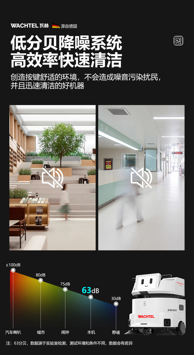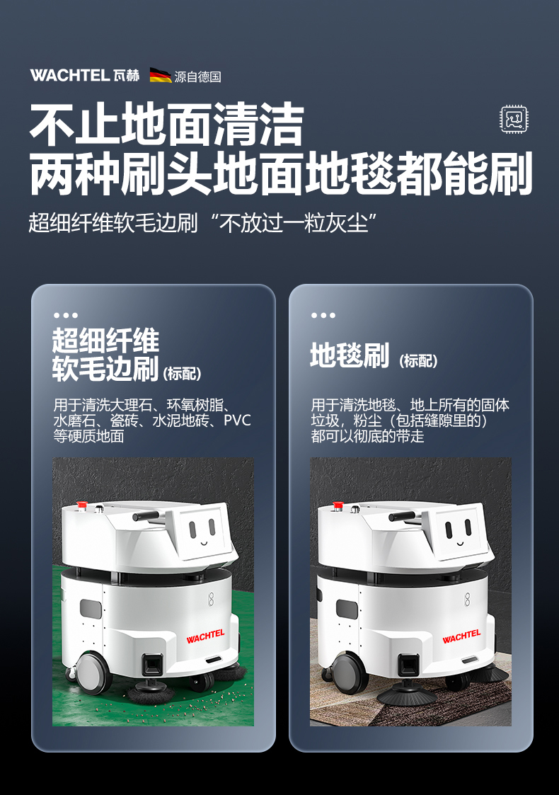 品牌:WACHTEL 名稱:掃拖吸一體智能機器人 型號:SW550 功能:掃地+洗地+吸塵+塵推 特點:自動充電+自動避讓+自動乘梯+斷點續掃 控制方式:自動/人工 外觀尺寸: 615*585*630mm 充電樁尺寸:430*290*440mm 清掃寬度:550 mm 清潔效率:1600m²/h 工作噪音:≤62dB 工作時間:5~8h 電池:24V/50AH鋰電池 重量:85kg 防護措施:激光雷達+超聲探頭+深度攝像頭