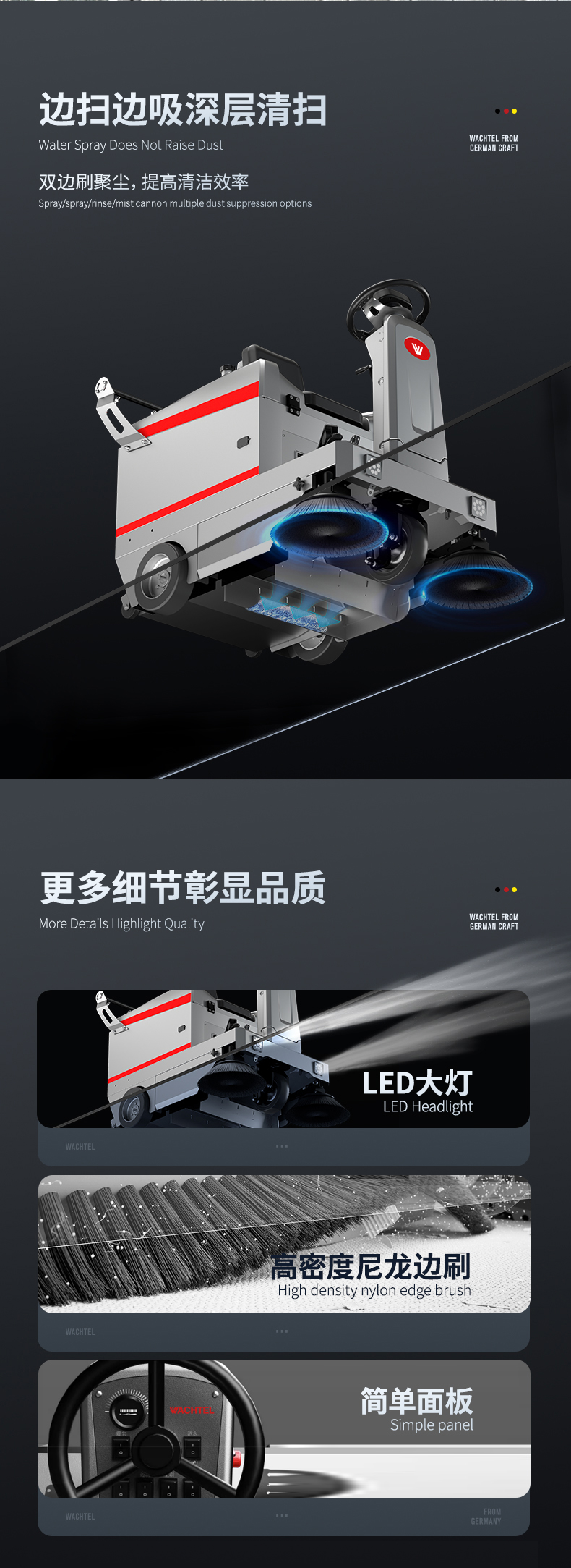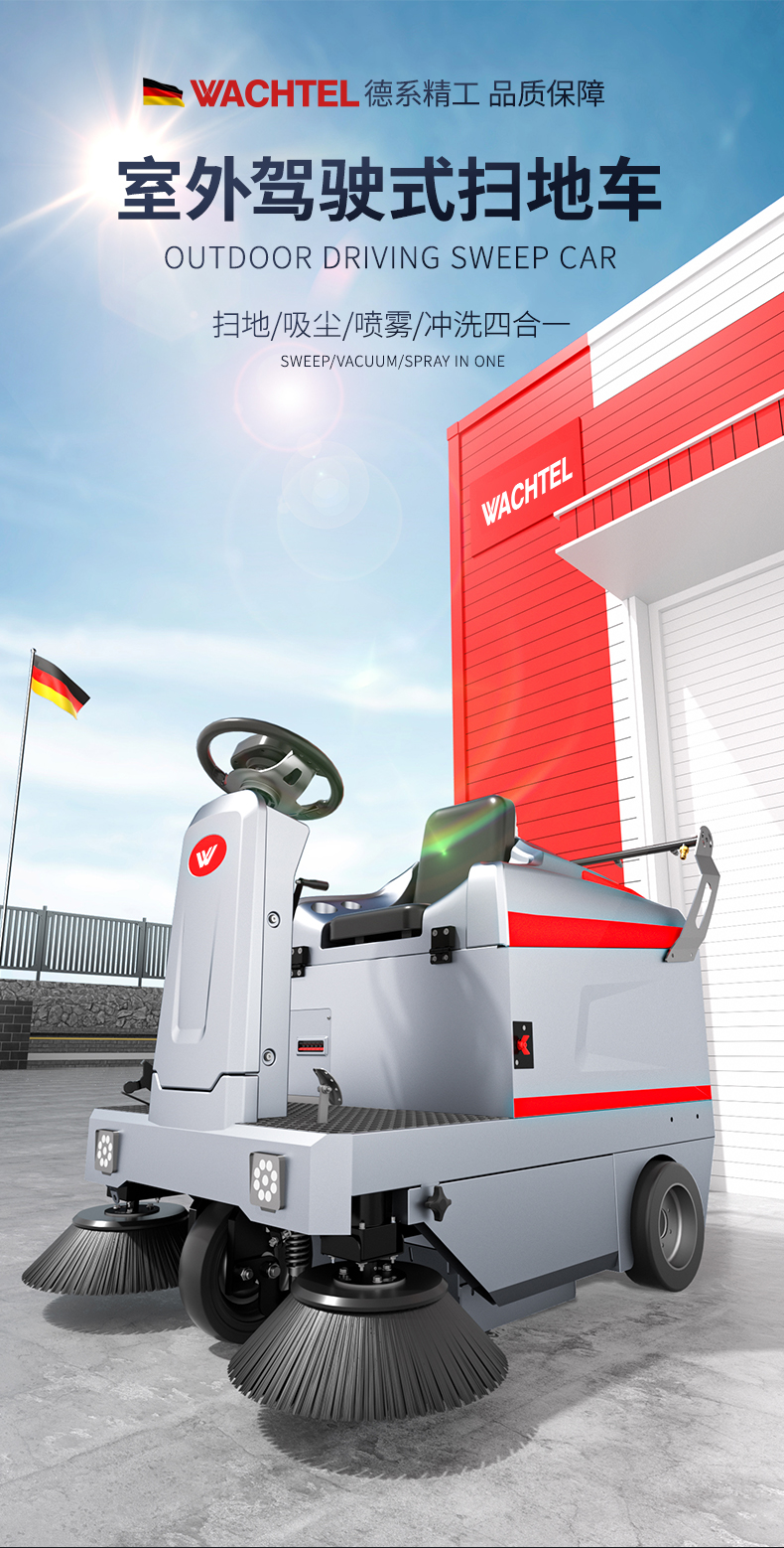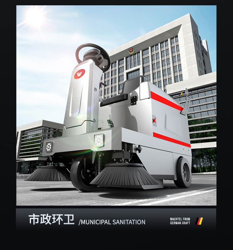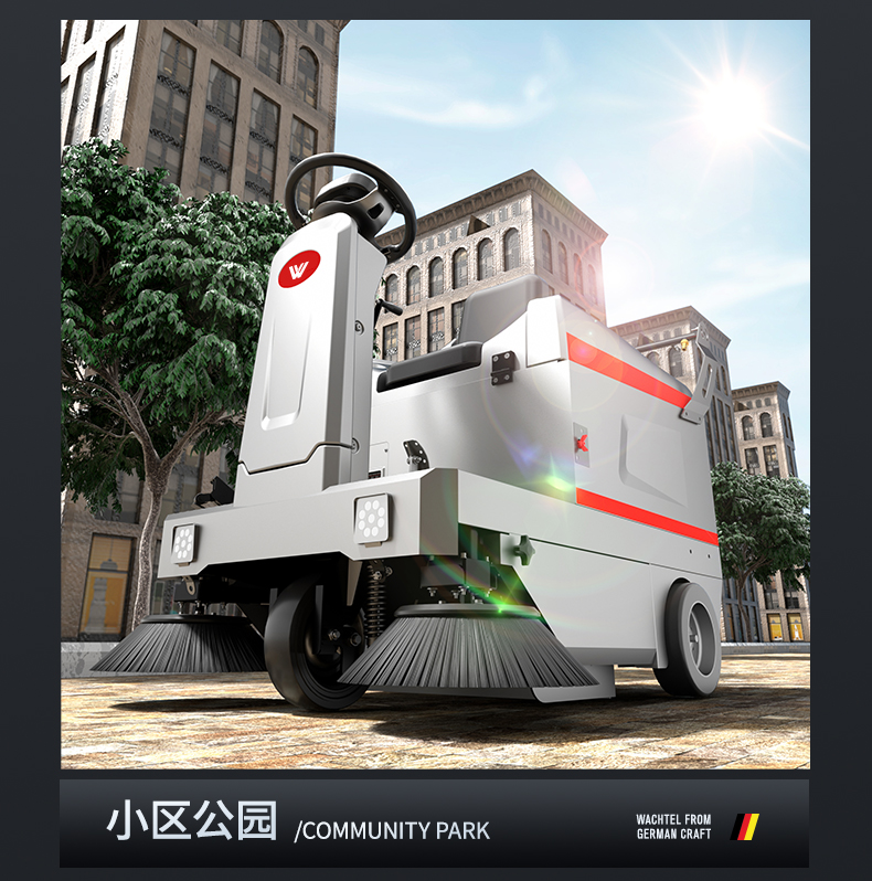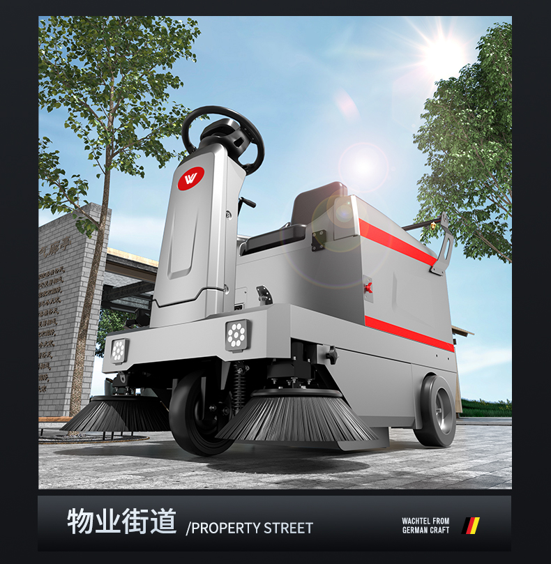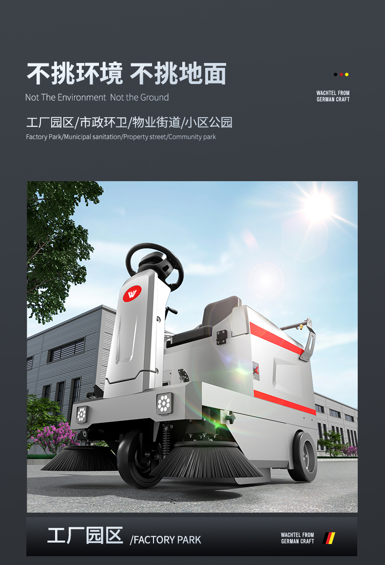 品牌:WACHTEL 型號: ST3 名稱:電動單吸風駕駛式掃地機 清掃寬度:1500 mm 清潔效率:12600m²/h 工作時間:3~5h 電池:意大利OM鋰電 電機::德國瓦赫電機 適用清潔場所: 園區(qū)、廠區(qū)、道路、車間、小區(qū)等