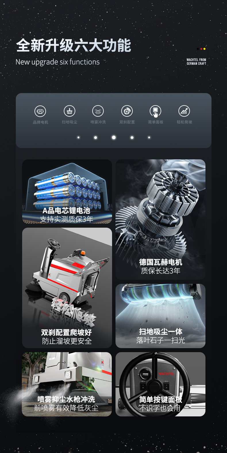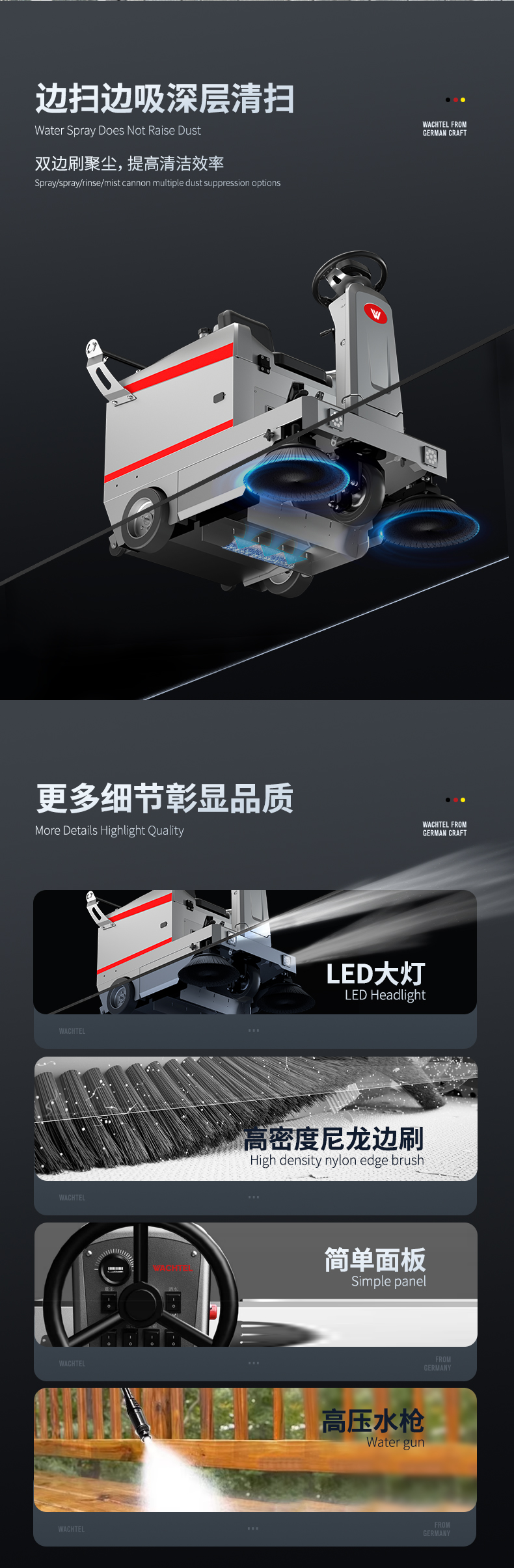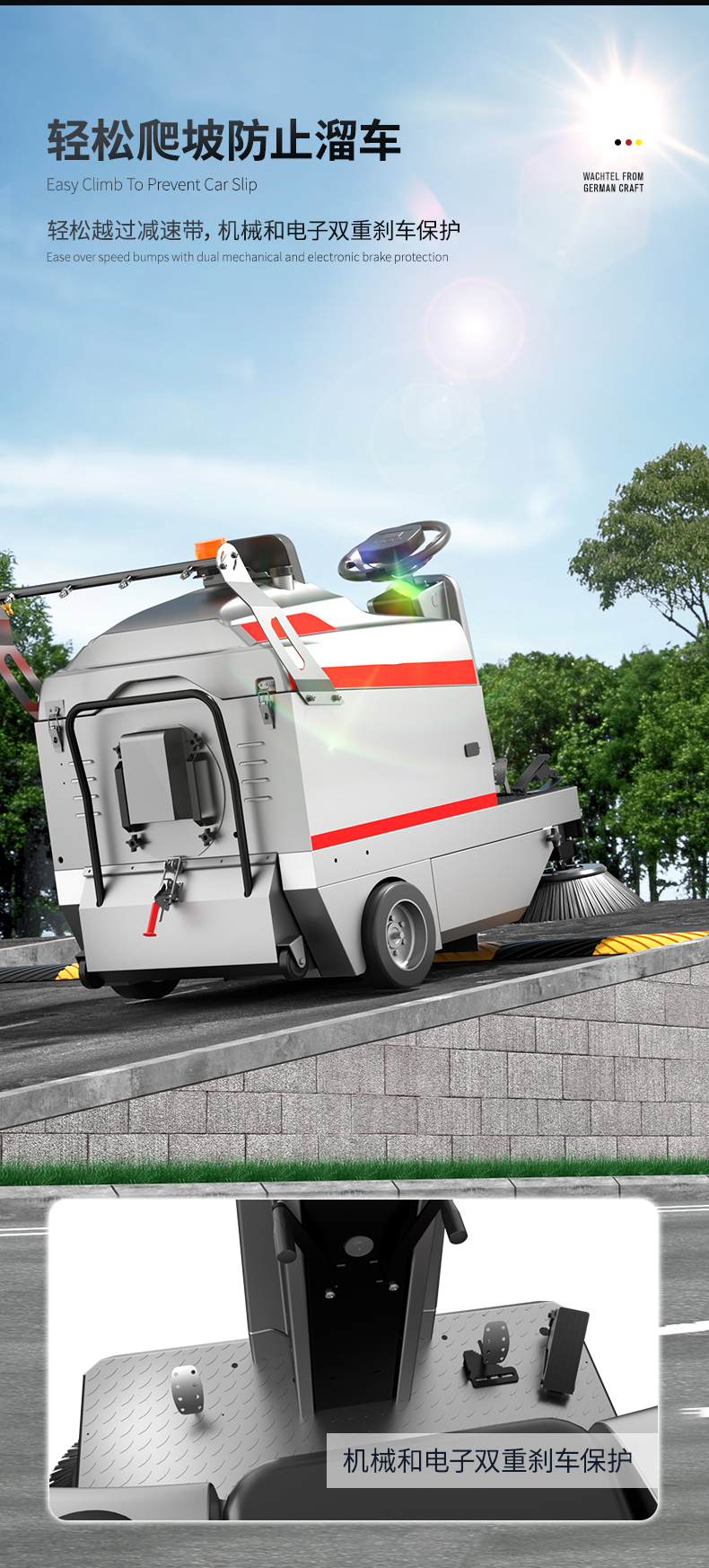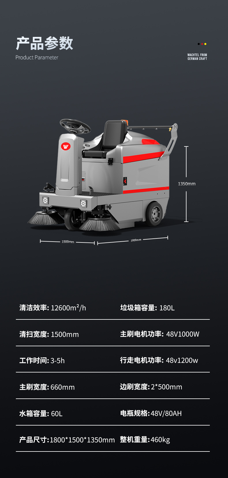 品牌:WACHTEL 型號: ST3 名稱:電動單吸風駕駛式掃地機 清掃寬度:1500 mm 清潔效率:12600m²/h 工作時間:3~5h 電池:意大利OM鋰電 電機::德國瓦赫電機 適用清潔場所: 園區(qū)、廠區(qū)、道路、車間、小區(qū)等